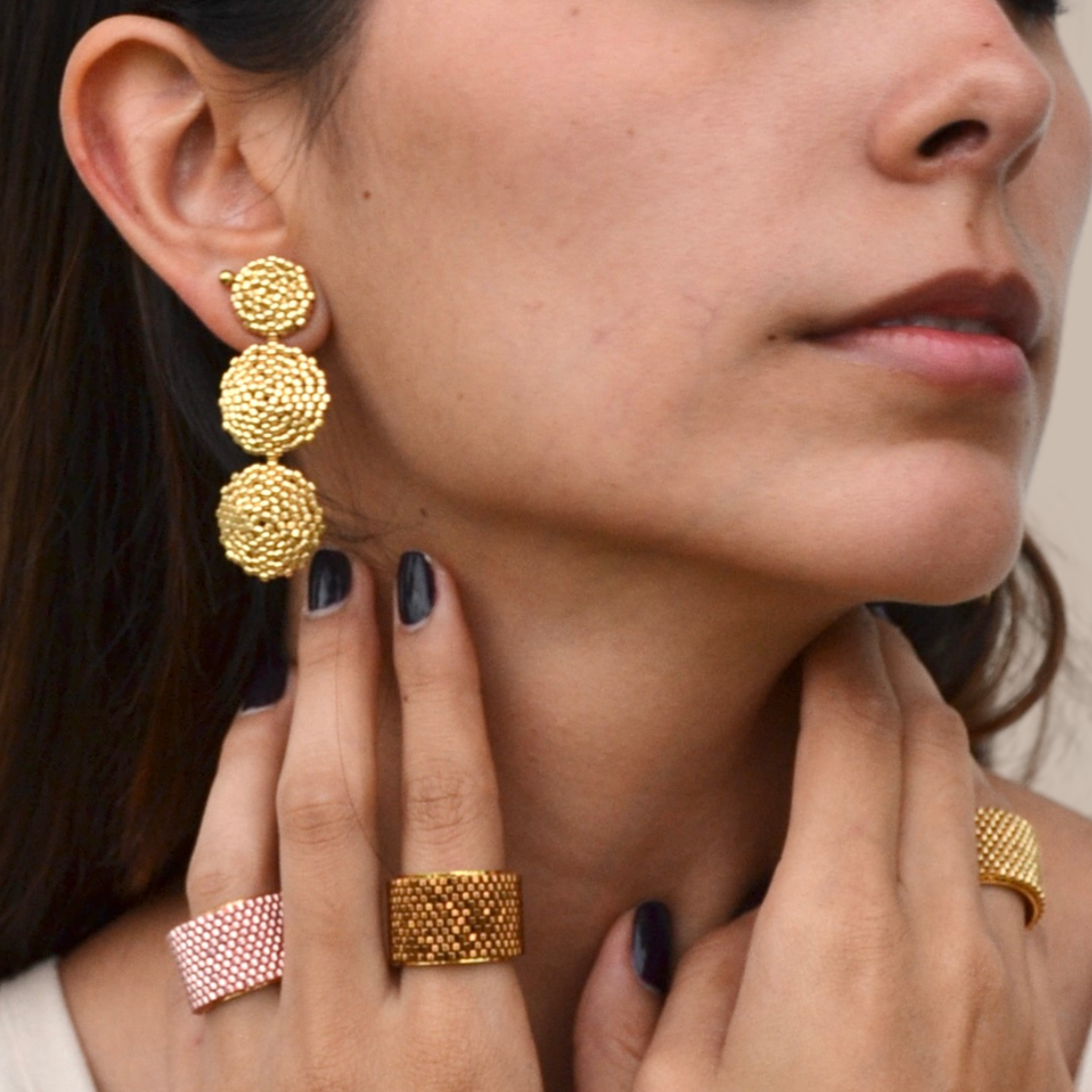 Los aretes Simona son una joya de autor, tejida cuidadosamente a mano con cristales japoneses de Miyuki. Su base es elaborada en bronce bañado en oro de 24K. Es un accesorio perfecto para elevar tu outfit en cualquier ocasión.