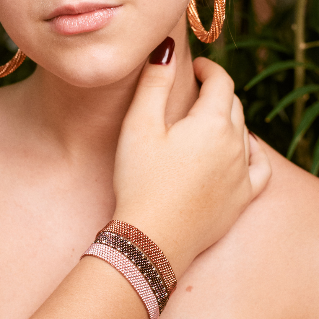 Cada pieza Martí es tejida cuidadosamente a mano, con vidrios de la marca Miyuki.