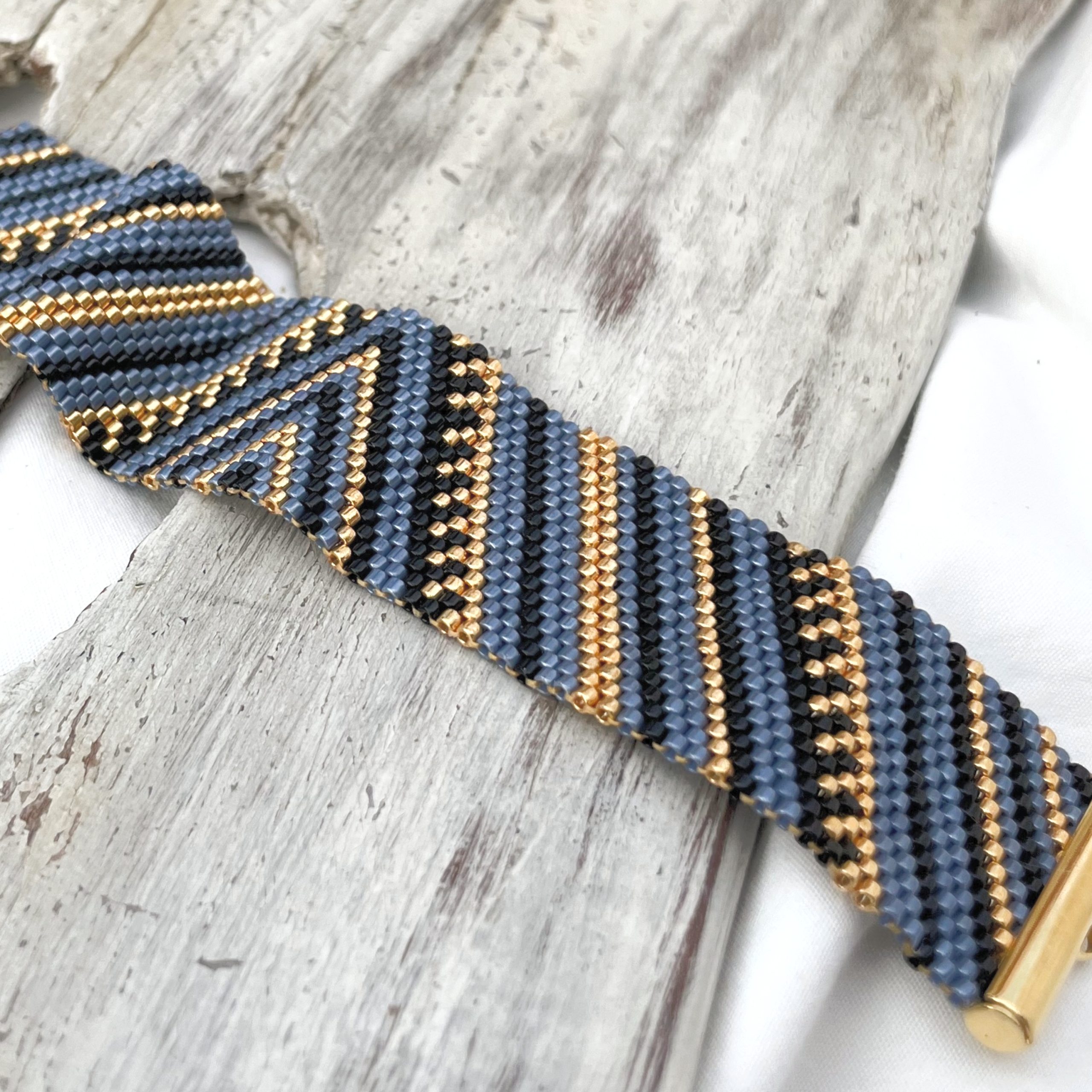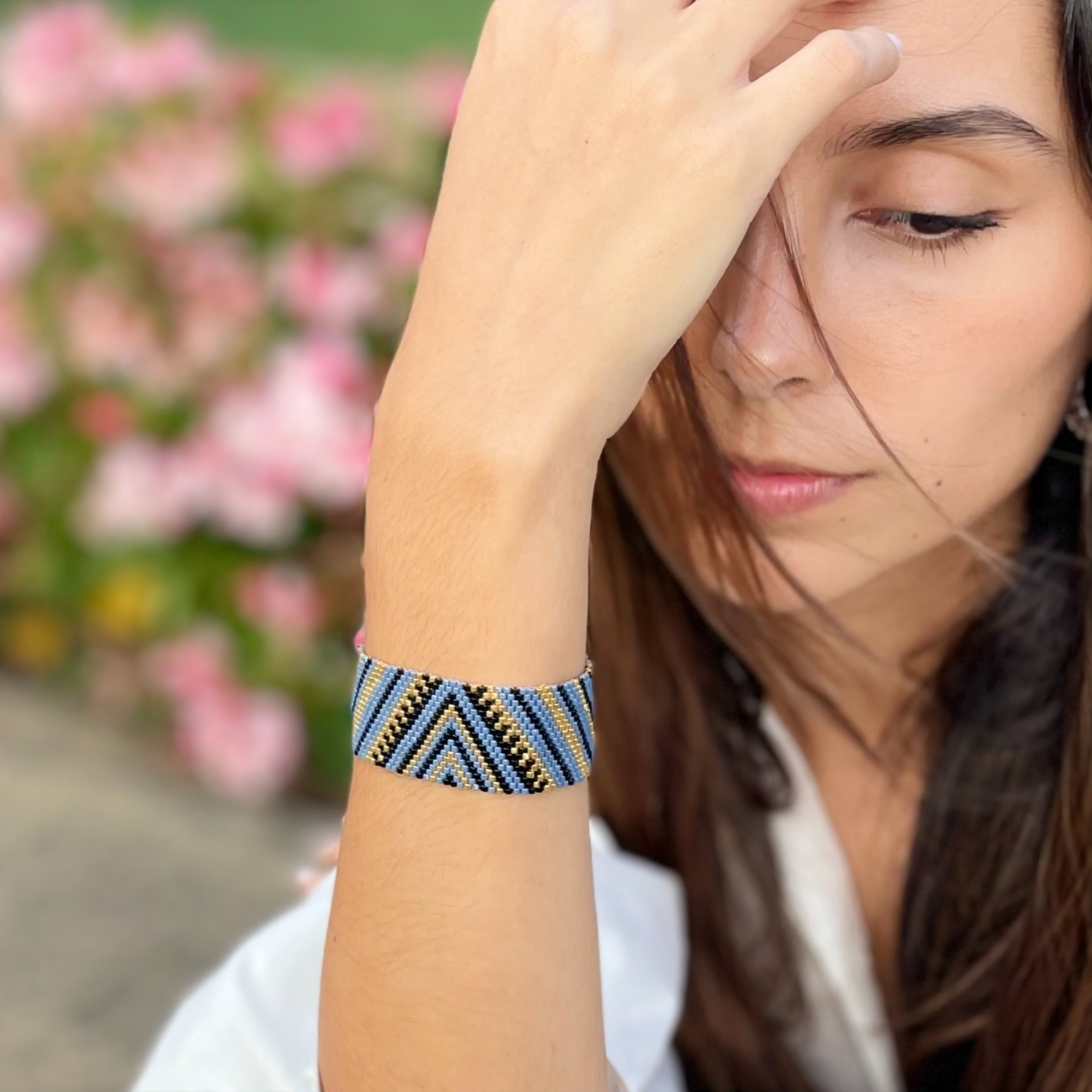 La pulsera Mila es una joya de autor, tejida cuidadosamente a mano con cristales japoneses de Miyuki. Sus terminales, herrajes y cadenas son elaboradas en bronce bañado en oro de 24K. Mide 17,5 cm de largo y 2,3 cm de ancho. Es un accesorio perfecto para elevar tu outfit en cualquier ocasión.