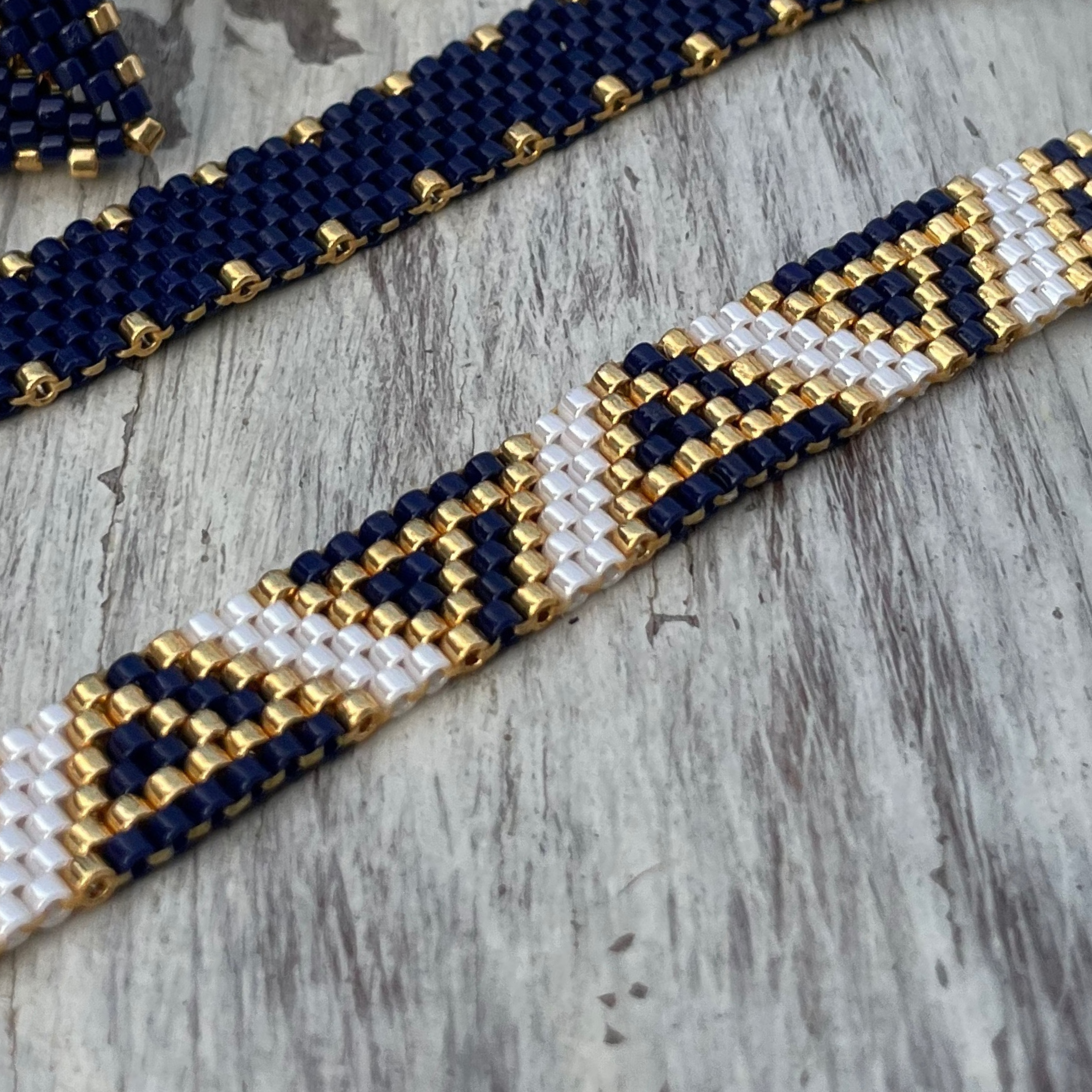 La pulsera Nena es una joya de autor, tejida cuidadosamente a mano con cristales japoneses de Miyuki. Sus terminales, herrajes y cadenas son elaboradas en bronce bañado en oro de 24K. Mide 17,5 cm de largo y 0,7 cm de ancho. Es un accesorio perfecto para elevar tu outfit en cualquier ocasión.